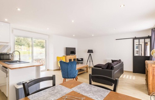 Detached house. Entrance with separate toilet, laundry cupboard (washing machine, dryer). Shower room. Office space / games room, dressing room. Living room with open kitchen (oven, induction hob, dishwasher, refrigerator with freezer, microwave, classic and Senseo coffee maker, kettle, toaster, food processor). Wood stove. TV, DVD, hi-fi system, Wii, ADSL internet, board games, coloring, toys, children's DVDs. Upstairs, bedroom 1 (160x200 bed) + 1 baby bed, bathroom, separate toilet, bedroom 2 (2 90x190 beds) + 1 baby bed and bedroom 3 (1 120x190 bed and 1 90x190 bed). Games room area. Sheets for hire. Bathroom linen for hire (1 large bath towel, 1 hand towel, 1 glove). Cleaning service at an additional cost. Electric heating included and wood for wood stove included. All charges included. Private enclosed courtyard. Private enclosed garden with terrace, garden furniture and deckchairs at the rear. Barbecue. Spa. Games. Parking. Set on the beautiful wooded hillside of Vurfresne and its southern exposure, this stone house has a large, bright living room. The owners have worked carefully to renovate this building and imagined a family-oriented gîte where children will find plenty of games. They will also enjoy the beautiful green space and the inflatable spa. For nature lovers, you can ask Edwina to show you their surrounding land where, at the bend of a path or near a pond, you might see a deer. Just minutes from shopping centers and the Cherbourg metropolitan area, the property is ideally located for visiting the port, the Cité de la Mer, or the Hague Peninsula, as well as for a business trip to this industrial area.