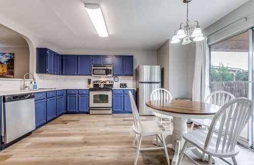 Welcome to this marvelous house in San Antonio. This charming property boasts 3 cozy bedrooms - one with a king bed, one with a queen bed, and one with a triple bunk bed, and a crib for the little ones. With amenities like central heating, AC, iron, fully stocked kitchen, guests will feel right at home. The bathrooms are equipped with hair dryers and complimentary body wash, shampoo, and conditioner, for added convenience. Enjoy the arcade with 13 classic video games like Ms. Pacman and Galaga. Sit on the back patio under the comfortable ceiling fan and watch the kids play in the large xeriscaped back yard. It's a super convenient location just 4 minutes from Lackland AFB, 10 minutes from SeaWorld, and 15 minutes to downtown and the riverwalk. You're sure to make fantastic memories with a stay at our place.