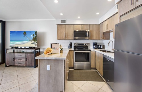 Maui Kai 504 is a fully remodeled one bedroom, one bathroom condo that features a fully stocked kitchen and an updated bathroom! With a King-size master bed and a Queen sleeper sofa, Maui Kai 504 comfortably sleeps 4 guests. Easily expand your living space by opening the double sliding glass doors. Let the fresh tropical ocean breezes cool you down or turn on the central air conditioning system for a quick cool off after a day in the sun. After a busy day enjoying our island paradise, relax in the recliner in front of the large flat-screen Cable TV. The unit also features complimentary WiFi.