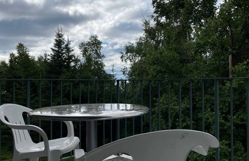 Anchorage Alaska. Large wooded lot on the beautiful hillside. Peaceful, private, spacious, bright & clean, rustic home on acre plus lot with vaulted open beam ceilings. 3 wood fire places -1 each per floor. Flowers, and open mountain inlet views/sunsets. 1-2 mi. from world class x-c skiing/bike, Hike & running trails. 35 mi. from Alyeska Resort, fishing, snow machining, 5 mi from shops/eating/movies/golf. Parking for RV, double carport, extra storage, 10 mi from Anchorage International Airport. 3+ bedrooms, can comfortably sleep 5+ (best suited for two couples or a family) , 2 decks, toaster, pro waffle iron, coffee maker, popcorn popper, blender etc, pans, spices, nice dishes, cups/ glasses, soaps, shampoo, laundry service, Guest Igloo, condiments, utensils, baggies, foil, gas grill, outdoor furniture, fans, books, binoculars, desk/work area, extra fridge/freezer. Everything you need to just walk in and enjoy.