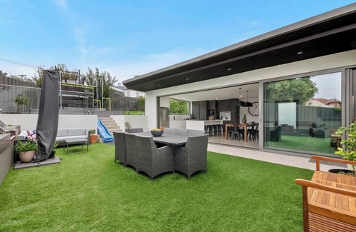 Discover a blend of heritage charm and modern comfort in this welcoming home, designed with your family’s needs in mind. The airy living area invites relaxation and effortless conversation, while the outdoor space beckons for unforgettable gatherings. Whether you’re lounging on the cosy outdoor couch, letting the kids enjoy the play equipment, or dining al fresco at the eight-seater table, the space is perfect for family fun and BBQs.