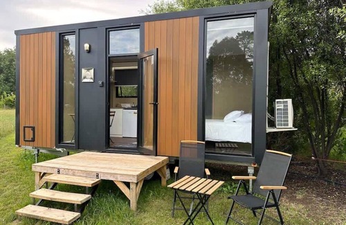 A cozy 139-square-foot tiny home with easy access to water, split air conditioning, a kitchenette, cooking equipment, and excellent bathroom facilities. These amenities include an eco-friendly cassette toilet with a removable waste holding tank, hand basin, and gas-heated shower.