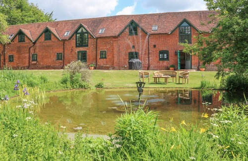Buckholt Stables has been converted into a characterful holiday let, nestled in Hampshire countryside, near West Tytherley. It plays host to three ground floor bedrooms, one with a four poster bed, and six first floor bedrooms, one withe a four poster bed and one with a twin room, sleeping 18 altogether. They each have either an en-suite bathroom or shower room, and there is also a cloakroom on the ground floor, followed by a kitchen, dining room, sitting room with an open fire and a boot room. To the outside is a walled garden with a pond and outdoor furniture, as well as ample off-road parking. Buckholt Stables offers the ideal retreat for a family getaway in the country.