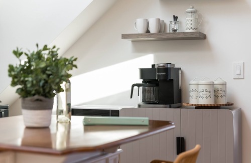 The kitchen is equipped with top-of-the-line appliances, including an oven hood range, gas stove, dishwasher, and garbage disposal. The kitchen also features a coffee bar with a french press, Keurig Duo, electric kettle, coffee and tea for your convenience.