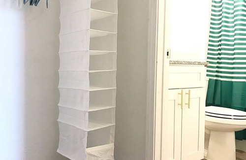 The closet is minimal with a free standing closet, hangers and a shoe rack. There is an on-site laundry facility for all of your laundry needs – credit card operated and cleaned daily to ensure everyone’s safety and a clean environment.