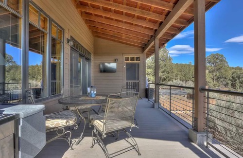 The Juniper Cabin is a comfortable two-bedroom home located in the Brasada Ranch Resort in Central Oregon. Features a gourmet kitchen, spacious living area, Chromecasts & WIFI, large deck with fire pit, outdoor TV, hot tub, & gas BBQ overlooking the 8th hole of the Brasada Ranch Canyons Golf Course.