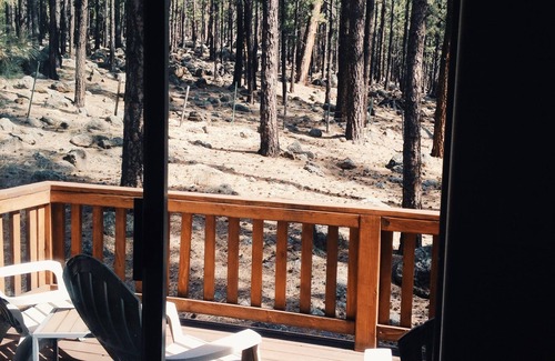 Enjoy the peace and quiet of our cabin that is secluded on 3+ acres and all homes on the street on 3+ acres as well. The cabin is surrounded by tall pines bordering National Forest on two sides. Deer and elk are frequently seen passing by when relaxing on the deck or when peeking out the cabins windows. Hiking trails are located right at the edge of the property and a beautiful meadow looking up to Mount Humphreys is a short walk from the back door.