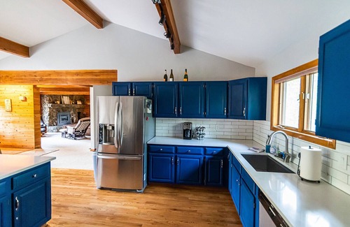 A large deck surrounds the first floor of the home. Also on this ground level you will find the 2 car garage (room to park 1 vehicle), kitchen, living and dining areas (table seats 8), washer and dryer, a 2 bedrooms which contains 2 Queen beds + 1 trundle and 2 full bathrooms. We have a pack n play available and booster seat. Enjoy the large leather sectional while watching tv, playing board games and/or relaxing near the gas fireplace. Use the gas grill to prepare your favorite grilled meals. There are also plenty of games to play! We added an air hockey table and Pop-a-shot in the walkout basement/bunkroom.