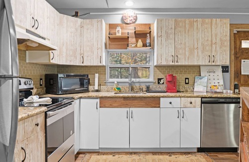 The heart of this getaway is the fully equipped kitchen, ready for culinary adventures or casual meals. Picture yourself gathered around the cozy fireplace in the evenings, creating memories that last a lifetime.