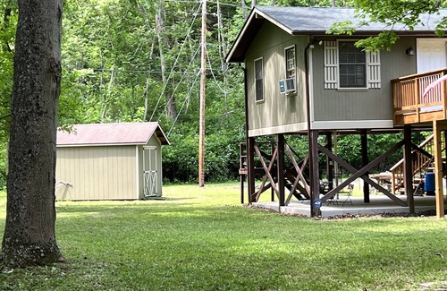 The cabin was remodeled in 2020 with new floors, a concrete pad underneath the cabin for entertaining, a beautiful new tile shower, and a fire ring that you can sit next to while losing yourself in the sounds of nature and the view of the stars! Its open floor plan allows for the family to stay close! One full-size bed and a pull out sofa bed are all you need to enjoy the relaxation! Let's not forget the wrap-around deck where you can kick your legs up and let the sound of the river put you to sleep!