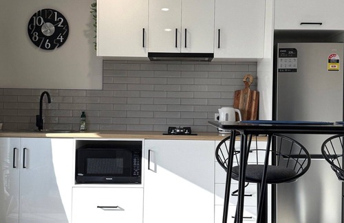 Open living area, with a leather lounge suite, luxurious foot ottomans, a smart TV, a breakfast bar and a well-equipped kitchen with gas cooking. It has a suitable-sized fridge/freezer perfect for 2 guests and a convection oven for your convenience.