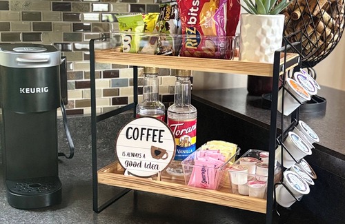 The master bedroom is on the upper level a loft with a king size bed with a master bath with a walk-in shower, the guest bedroom has a queen size bed and a guest bathroom with a shower tub, the fully equipped kitchen with stainless steel appliances and dark stained cabinets give you the ultimate home feel. The kitchen has a toaster, coffee maker, dishwasher, Keurig coffee machine, 4 burner flat top stove and microwave oven, the kitchen is stocked with pots and pans kitchen utensils grilling utensils and knives, electric skillet and crock pot, the refrigerator has ice maker and filtered water, the living room is my favorite spot in this cabin with cathedral pine ceiling with cathedral windows and a beautiful rock fireplace with gas logs, walk out from the living room onto the deck and enjoy the outside where you can set and take in the countryside or grill your favorite meal on the gas grill over looking the pond area, you can also enjoy the 5 person hot tub that sets on the front porch, a full size washer and dryers is in the cabin, for extra sleeping area their is a sleeper sofa in the living room and a queen size air up mattress in the closet, the pond is open for fishing we do have it fully stocked for catch and release.