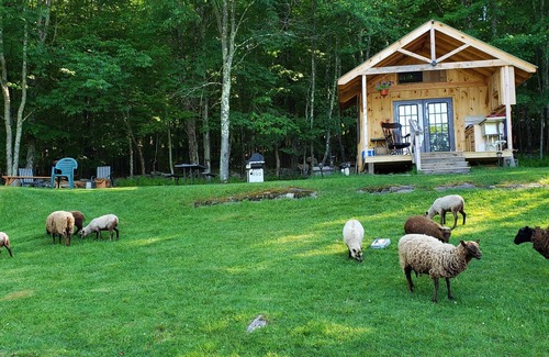 This is your cozy mountain dream place with amazing views of the Sullivan Catskill Mountains. 12 x 12 Cabin with 8 x 12 covered porch. Enjoy the farm animals and mountain top views, 6 miles from Bethel Woods Center for the Arts, home to the Woodstock Festival of 1969. Visit the museum and all the other great area attractions and return home to your cabin where you can relax on your covered front porch while you take in the views of the sheep and mountains while you enjoy your camp fire, grilled food and beverages. Solar powered, 12 x 12 Cabin with Queen murphy bed, and sleeping loft with two twin mattresses. Table and two chairs outside on the porch, stocked cabinet Includes pots,silverware and dishes, fire pit, one stack of wood, gas grill, propane. Gorgeous views of the foothills of the Catskill Mountains. Compost toilet behind the cabin, via a door from inside cabin. Outdoor hot shower for one, two or more! Save water shower with a friend! Cabin sleeps up to 4, using the loft.