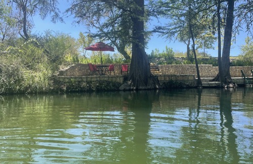 This 1 bedroom 1 bath unit will sleep up to 4 people and is complete with a queen bed and pull out queen sofa with electric air pump. The Cabin comes with a full kitchen, both covered and open patio, covered car port, and sits high on a hillside. It boasts a fabulous view eastward down the Guadalupe River Valley toward Kerrville, TX. The unit is complete with 43" Direct TV and fast Wi-Fi. In addition, there is private access to our river front, which is an easy 1/4 mi drive in a low clearance vehicle or a nice walk. It offers deep water swimming, canoeing, kayaking, floating, and fishing along with privacy for your enjoyment. For those of our guests who enjoy bird watching and hiking, we have private acreage on the property that is accessible for those who wish to partake.