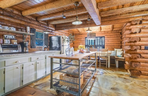 Watch downtown Wimberley come to life each morning as you relax on the front porch of our family-size log cabin vacation home. An upstairs loft has a luxury King size bed with pillow-top mattress, Comphy brand sheets and down-filled comforter plus a beautiful hand-made, custom chandelier. The second bedroom has a full / twin bunk bed perfect for relaxing after a busy day. The queen sleeper sofa provides additional sleeping space for a total of seven. A pack and play provide a safe spot for an infant or toddler. Your kitchen includes a full-size refrigerator, microwave, Keurig coffee maker with coffee, plenty of dishes, crock-pot and electric skillet while a private propane grill in the back yard provides a place to cook up steaks or burgers. The cozy living space has room to lounge with a big screen Smart TV and Netflix. One bath includes a large shower. Home Away From Home