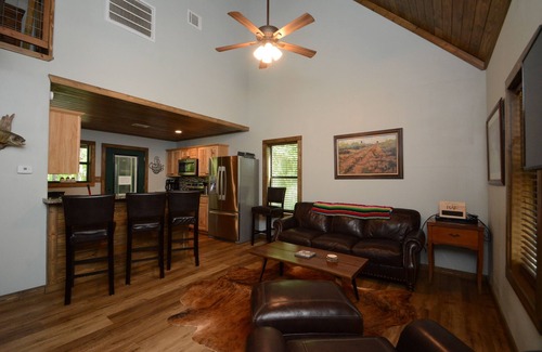 Front door opens to a living room furnished with well appointed leather bar stools, sofa and chair. On cold nights don't hesitate to turn up the faux wood burning stove. The master suit has a queen size bed with an exterior door to a covered porch which overlooks the pond. Tuck the kiddos into their rustic bunkbeds after they have had a day playing outdoors enjoying a closet full of games. In addition to two bedrooms enjoy a queen sized loft with barn doors and a adjusted air flow system to keep guest comfortable and a desk for those who might need to check in at the office. The kitchen is not just spacious and equipped with all the necessities it is stocked with fresh on site farm eggs and sausage. Other amenities include a rock swimming pool, his and her pool side restroom/shower facilities, palapa, outdoor kitchen, fishing and walking trails.