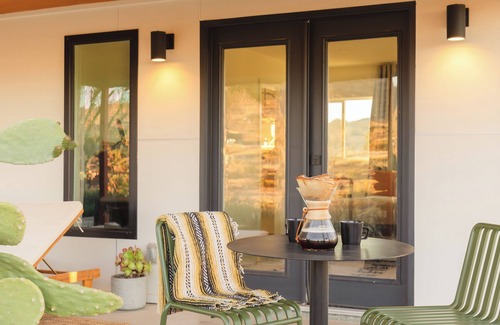 Welcome to Calico Landing, a modern desert oasis in Yucca Valley, just 15 minutes from Joshua Tree National Park. Perched on a scenic hillside with sweeping views, this private two-bedroom retreat blends elevated design with the natural beauty of the desert. A sparkling heated pool, spa, and serene outdoor lounges invite sun-drenched days and starlit nights.