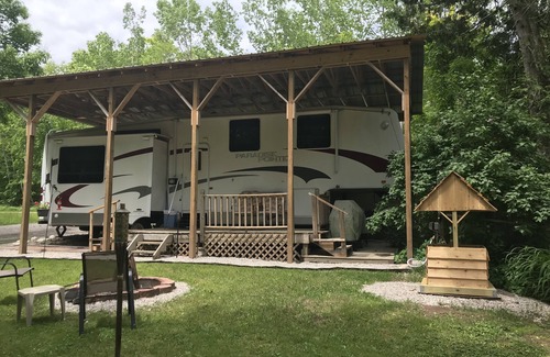 Camping with all of the comforts of home. This cozy 36’ RV provides all that you’ll need for an unforgettable escape. Situated on a private lot with water, septic and electricity and Complete with a covered deck, bonfire pit, and picnic table. Enjoy the surrounding wildlife and the abundant attractions in the area. Within 1/2 mile of the unique Waterfront village of Curtis Michigan, the property is surrounded by many lakes for fishing & water sports. ORV Trails are also easily accessible.