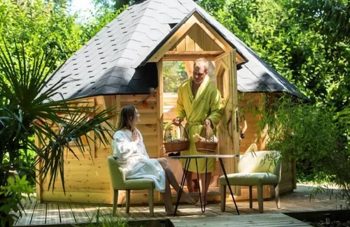 Enjoy an unusual night between nature and spa near Chantilly... Stay in a wooden bubble with star views for an exceptional night under the stars, in the middle of nature?. Will you sleep under the trees, sheltered from eyes in a real cocoon with your favorite duo? Amenities: The Wooden Bull includes a double bed and a small table with its chairs, a spa and sauna. At your disposal: Nespresso coffee machine, kettle, mugs, glasses, coffee taps, tea, water and minibar. But also:? A Bluetooth speaker, toilet linen, bathrobes, a bath set (shower soap and shampoo). For a romantic night, enjoy our outdoors with a double hammock, a brasero and its logs in your terrace to warm your evening! Remember that the bubble does not have a private bathroom, you will have to go to the sanitary block of the campsite located at 80m? With the option "reconnection & heritage", enjoy a dinner for two in your bubble! We only wait for you to enjoy this memorable stay!?