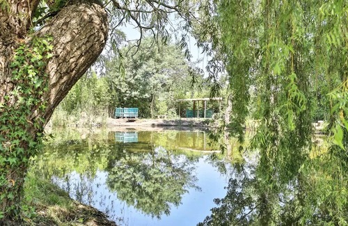 View of our fishing pond of 1,400m2, you will be at the first lodges to fish carp, carp and other fish or simply enjoy the quiet of the campsite and its aquatic life for a family holiday.