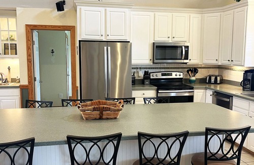 The spacious living area features cathedral ceilings, a cozy wood-burning fireplace, and an open layout that flows into a modern, fully equipped kitchen. There’s a wet bar for easy entertaining and a large island with seating for ten, ideal for family meals or casual hangouts.