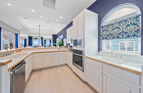 Inside, the open-concept layout features a spacious living room with plush seating and a large flat-screen TVβgreat for movie nights or game days. The fully equipped kitchen includes modern GE Profile appliances and everything you need to cook up your favorite meals. A washer and dryer are also conveniently located on the main floor.