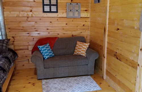 Cabin is rustic with solar lights and propane heat. There is no bathroom or kitchen inside the cabin, however there is a common area kitchenette and bathroom/shower. The cabin has its own fire ring and grill. Each stay comes with a free gift.