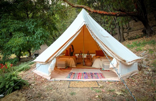 The Emerald Triangle glamping retreat is designed to offer a memorable getaway for visitors seeking a transformational eco-retreat along wild and scenic South Fork Trinity River, featuring private tent accommodations, a shared kitchen and dining area, veggie gardens, hanging chairs, and forest trails.