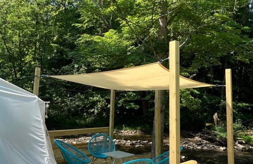 This is Site #1. Picturesque setting in rural southwestern Pennsylvania. Misty mornings are almost a given in the summer and the limited light pollution in our valley makes for fantastic stargazing. Stretch and stargaze from your deck, or right from your queen size bed with ceiling canvas tent views. Wade into the creek outside your tent door.