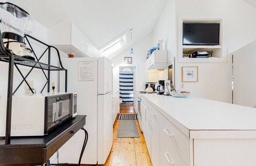 The open living area, with vaulted ceilings and skylights, offers a great flow for entertaining. Compose postcards at the writing desk or watch favorite shows on the 32” TV with cable. A sofa offers comfy seating. Prepare your own home-cooked meals in the well-equipped kitchen, fully stocked with all the cookware and gadgets you might need, and dine in the sunlit dining area or breakfast bar.