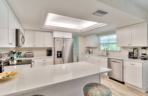 The kitchen is new and fully equipped with ice-making refrigerator, microwave, dishwasher, Cuisinart drip coffee and Keurig machines, and all utensils. The adjacent open dining area has a table for 4 and stools at the kitchen bar for 2 more. A Weber gas grill is outside the kitchen and pool area, with a spare propane tank always available for heavy use. A new washer and dryer are provided in the adjacent laundry room.