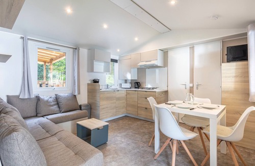 Located in Longeville-sur-Mer, the caravan Mobil Home 151 with step-free interior has everything you need for a relaxing holiday. The 34 m² property consists of a living room with a sofa bed for 2 people, a kitchen, 2 bedrooms and 1 bathroom as well as an additional toilet and can therefore accommodate 6 people. Additional amenities include a TV as well as a washing machine. This accommodation does not offer: Wi-Fi, air conditioning and towels. Features a shared, heated indoor pool for guests to enjoy.