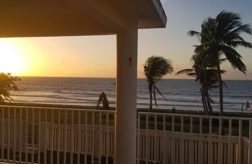 New Kitchen and Kayaks! Our spacious, fully equipped waterfront beach house in Humacao welcomes you to the Caribbean with the accessibility and security of the U.S. territory of Puerto Rico. Enjoy a unique experience living right on a sandy beach, where the gentle sound of waves lulls you to sleep and will also greet you in the morning as the sun rises over the ocean. You'll love the huge balcony (12 x 50ft.) overlooking the ocean for breakfast, dinner, and watch the clear night sky over the water. When you are ready for activity, take the kayaks to the nearby islet, swim on the shallow beach, hike up to El Morillo for a killer view, then get amazing fresh seafood - its a fishing village! The house has A/C in all 4 bedrooms and is located in a quiet, 2-mile sandy beach, yet you will be 10 minutes to world class golf, casino, restaurants; 20 min. from Fajardo for day-sailing to other islands, or take a kayak trip at the Phosphorescent Bay. 15 min. to surfing beach El Cocal. 10 minutes to Humacao Nature Preserve.