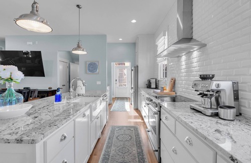 Enjoy amenities like fully stocked kitchen for cooking, marble counter tops, large island with farm sink, overlooks the open Dining and living room, abundance of natural light, tall ceilings with open floor plan for entertaining or relaxing.