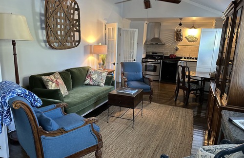 You are viewing the separate upstairs unit, Wren's Nest. This picturesque South Carolina carriage house sits next to our home, Craven House, in the beautiful historic district in downtown Beaufort, one block from the Beaufort River marina, Bay Street shopping, museums and restaurants. Walk everywhere, even to the post office. Wren’s Nest has 2 bedrooms, one with a queen bed and the other with a full bed. In between the two bedrooms, there is a shared full bath. The unit has hardwood floors throughout and a fully fitted kitchen. Relax on the porch or furnished patio surrounded by 100 year old oak trees draped with Spanish moss, lovely gardens and historic homes. The sound of the church bells of nearby St Helena Church, one of the oldest continual working churches in the country, will take you back into the 18th century.