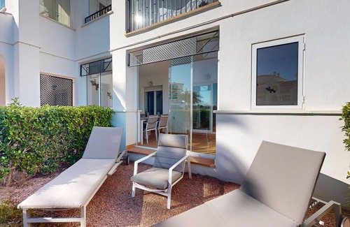 Very modern 2 bed ground floor apartment with stunning golf views on Hacienda RiquelmeThe property comes fully equipped with: private garden, garden furniture, terrace, washing machine, internet (Wi-Fi), childrens area, tennis court, padle court, central heating, air conditioning throughout the house, communal swimming pools and own garage parking space.In the kitchen, refrigerator, microwave, oven, freezer, dishwasher, dishes/cutlery, kitchen utensils, coffee machine, toaster and kettle are provided.Hacienda Riquelme Golf Resort offers, as well as the Nicklaus designed, 18-hole golf course, a driving range, putting and chipping greens. The golf course is a par 72 and 6416-metre course. It covers an area of 71 hectares and has a mountain backdrop and panoramic views of the coast. The El Casón de Riquelme Restaurant, set in the resort's 19th-century colonial-style Hacienda, has seating inside, with an outside terrace area, looking out over the original walled gardens. The rest of the resort centre follows the same architectural style and contains a golf shop and supermarket. The El Palomar Bar, set in a restored dovecote, overlooks the golf course and is open for drinks and snacks in the summer. Our guests staying at Hacienda Riquelme also have the added benefit of our fully staffed office at the resort, where you can get assistance, advice and recommendations, as well as help with any aspect of your travel or accommodations. Our staff speak Spanish, English.