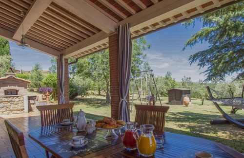 6-room house 220 m2 on 2 levels. Bright, cosy furnishings: living room with open-hearth fireplace, satellite TV and CD-player. Exit to the terrace. Living room. Exit to the garden. Kitchen (oven, dishwasher, 4 gas rings, toaster, kettle, electric coffee machine) with dining table. Exit to the terrace. Shower/WC. Upper floor: 1 room with 1 bed (80 cm), 1 french bed (160 cm). 1 room with 1 bed (80 cm), 1 french bed (160 cm). 1 room with 2 beds (80 cm). Bath/shower/WC. Gas heating. Parquet floors, natural stone floors. Large patio 160 m2. Terrace furniture, barbecue, deck chairs (8). Marvellous view of the countryside. Facilities: washing machine, iron, children's high chair, baby cot for up to 2 year olds. Internet (WiFi, free). Parking (fenced) at the house. Please note: non-smoking house. Private entrance. No mandatory extra charges to be paid on-site except for local tax. IT048008C27ZM853OL