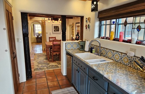 The home is an easy stroll into town and Taos Plaza for meals, or utilize the home’s fully equipped modern kitchen to dine in, or grill outside and dine al fresco in the garden. The home is stocked with games, puzzles, playing cards/ poker chips, books, DVDs/movies, vinyl records and turntable, and cable/Blue Ray entertainment system for family time and relaxation in the beautifully furnished living area, which features coved viga ceilings, a kiva fireplace, and abundant natural light.