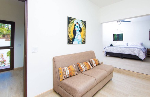 Casa Cascada (waterfall house) est 2012. One acre of lush tropical gardens, many palms cacti, indigenous plants with fruit and vegetable gardens. Completely private oasis. The central feature of the property is a pool waterfall and pool bar. The roof deck of the main house has a fantastic 360 degree view including beach, ocean and one of the best places to watch amazing sunsets! Casita offers 1 bedroom with king bed and a pull out couch full kitchen, living rm. full bath with sundries. LED T.V. Netflix,WIFI.