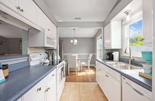 Fully equipped kitchen, Keurig & drip coffee maker, cookware, and dining essentials.
