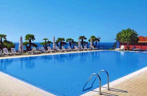Guests have access to the shared swimming pool with diving board, equipped with tables, chairs, umbrellas, sun loungers, restrooms, and a stunning view of the Ligurian Sea.