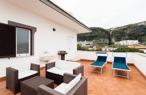 This top roof apartment is on the 5th floor accessible by two elevators or by stairs and it consists of a large living room with a comfortable sofa and a single sofa bed, a dining area with a table for 4 people, a TV, air conditioning and heating and from here you have access to the large equipped terrace that surrounds the apartment and is equipped with outdoor table and chairs, comfortable sun loungers and sofas where you can relax and sip a drink while enjoying the beautiful view of Sorrento and the Gulf of Naples. Each room has access to the terrace surrounding the apartment.