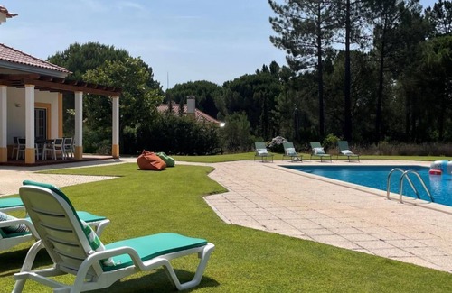 Large, luxurious "rustico" cottage "Casa dos Loendros". 102 houses in the resort. 14 km from the centre of Alcácer do Sal, 14 km from the centre of Comporta, in a secluded, quiet position, 16 km from the sea, 16 km from the beach, 1.6 km from the river, in the countryside, in the woods. For shared use: property 997 ha (fenced). Tennis (2 x hard court) (extra), basketball (extra), children's playground. Private: property (fenced), swimming pool angular (6 x 12 m, depth 110 - 190 cm, seasonal availability: 01.Jan. - 31.Dec.). Outdoor shower. In the complex: reception, restaurant, WiFi, air conditioning, washing machine. Parking on the premises. Supermarket 2 km, restaurant 2 km, bus stop 15.1 km, sandy beach "Praia da Comporta" 16 km, lake Herdade de Montalvo 50 m. Marina 31 km, golf course (18 hole) 30 km, tennis, riding stable, walking paths from the house 50 m. Nearby attractions: Comporta 16.2 km, Praia fluvial, da comporta 9.3 km, Estação Arqueológica de Abul 35.8 km, Tróia 30.1 km, Alcácer do Sal 14.4 km, Viveiro Florestal da Mata Nacional 16.8 km. Please note: car recommended. Suitable for families. Loading and unloading of baggage is possible at the holiday house. 24hr guard.