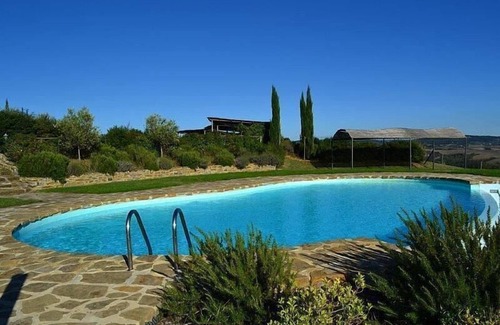 You will reach the swimming pool from the villa going down a route that cuts through the garden and includes approximately six stairway steps. The pool is 7 meters (23 feet) large by 14 meters (46 feet) long, from 60 centimeters (2 feet) to 1.80 meters (6 feet) deep. The swimming pool has a sinuous shape. It is an infinity pool. The area is equipped with sun loungers and an external shower, and it is partly shaded by a characteristic pergola with a bamboo roof. From the swimming pool you will enjoy a fascinating view of the Crete Senesi and of the greenery. You will share the pool with guests staying at 7 other apartments. The swimming pool is open from the beginning of June until the end of September.