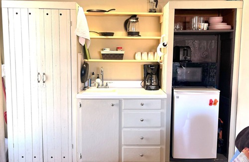 The King Suite provides simple luxury for the single traveler or a cozy, romantic nest for a couple. You’ll enjoy a comfy king-size bed beneath a cathedral ceiling, a full bath, a kitchenette, private parking, and a view of Sleeping Lion Mountain from your windows! Just out the door, take advantage of your own flagstone-walled patio. You’ll find a flat-screen TV with complimentary Netflix (plus login to any of your other favorite streaming apps that you have an account with) and free wireless.