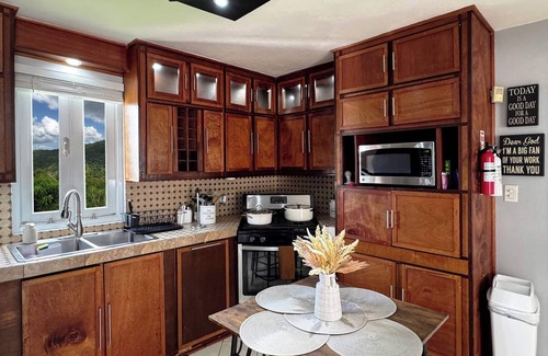 Unwind and recharge at our peaceful country retreat, where stunning views, fresh air, and total relaxation await. Nestled in the heart of the countryside, our cozy getaway offers the perfect blend of rustic charm and modern comfort.Take a dip in the heated pool, soak up the panoramic views, and enjoy serene moments surrounded by nature. Whether you're sipping your morning coffee on the terrace or watching the stars from the hot tub at night, this is the ideal place to slow down and reconnect.This property is located in the lush central mountains of the island. There are many restaurants and activities located in the neighboring pueblos of Comerío, Barranquitas and Naranjito.It is a perfect place place to escape with your family and friends! Bedrooms LayoutSleeps up to 12 guests 5 Bedrooms 4 Full Bathrooms an extra bathroom near the pool!*Primary bedroom with gorgeous panoramic views from the queen bed*Ensuite bath*AC TV*Located on the main floor of the house with direct access to a spacious terrace*Guest bedroom with a queen bed*AC TV*Located on the main floor of the house adjacent to the living space*Guest bedroom with 2 bunk beds (twin over full)*AC TV *Located on the main floor of the house down the hall from the living space and near the guest bath*Guest Suite with queen bed*Ensuite bath*TV AC*Located on the lower level, steps from the pool open deck*Second Guest Suite with queen bed*Ensuite bath*TV AC*Located on the lower level, steps from the pool open deck Living Spaces*Fully Equipped Kitchen with a dining area*Spacious living room open to the kitchen Outdoor Oasis* Heated Pool 12’ x 24’ and 3’-5’ deep* Covered BBQ area outdoor kitchen* Separate bathroom for the pool area* Seating areas on both terrace levels* Breathtaking views! Parking *Free on-site gated parking for up to 2 vehicles Location:• SJU Airport 1 hr 15 min