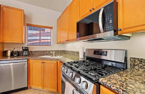 The home’s charming interior has everything you need to maximize your downtime, complete with contemporary furnishings and sophisticated décor. Sink back into plush sofa seating while you turn the pages of that new book you’ve been saving for just such an occasion. The fully equipped kitchen offers stainless steel appliances, glossy stone counters, and warm wood cabinetry for storing all your snacks alongside provided cookware and dining ware. Enjoy meals both large and light seated up on high-top stools at the island, while the breezy patio is the perfect spot to take your morning coffee as you make your plans for the day.