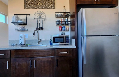 Cozy casita adjacent to the main house on a one acre lot. New construction, A/C, separate sleeping area from living area. Queen bed with mattress topper. Futon couch to provide additional sleeping accommodation. Wireless internet - 4G speed, 40-60 mb average, 10 mb upload average. Fire TV in living room. Small kitchenette that includes a refrigerator, toaster, coffee maker, crockpot, hot plate, etc. There is a wall mounted folding table that can be utilized for a desk or eating area. Steps away from walking trails in the beautiful Rio Verde area. Off the beaten path with very little traffic and wildlife all around. Closest grocery store is roughly 20 minutes away.