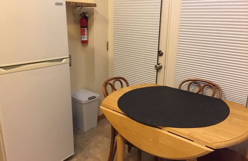 As you check our photos, the studio has blackout curtains between the king size bed, and the full size hide-a-bed. Plenty out storage space, this area goes out to the fenced area, with hot tub.
