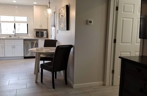 A truly classy 1 bedroom, 1 bath casita with a top of the line kitchen and separate entrance with private courtyard all within walking distance to Kierland and Scottsdale Quarter. The gorgeous paved courtyard is landscaped with a patio table, 2 lounge chairs and your own grill. The bedroom includes a walk-in closet with stackable washer and dryer, iron and iron board and all the room needed for any length of stay. The 50-inch tv in the living area and the 43-inch TV in the bedroom both are new 4K TVs with available Roku service if you have an account plus COX cable TV service and high-speed wireless internet service all of which are included. All the linen and towels are supplied as well as fully stocked kitchen. Utensils, top of the line stainless steel refrigerator with water and ice in door, full size dishwasher and convection microwave over counter top induction cooking with all pots and pans and Air Fryer. Coffee maker and coffee is also provided. The counter top toaster, broiler is large enough to broil a small chicken. Relax and watch TV on a beautiful leather couch which opens to a queen size bed. You will find the bathroom and shower fit for a 5-star hotel.